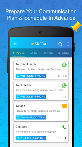SKEDit is a free and easy-to-use scheduling app that lets you schedule WhatsApp messages, schedule SMS, send emails later, schedule posts, and set call reminders. This top-rated Android scheduling app acts like your personal virtual assistant. Put your communication on autopilot with SKEDit, the free 5-in-1 WhatsApp scheduler, SMS scheduler, Call scheduler, and Email scheduler.