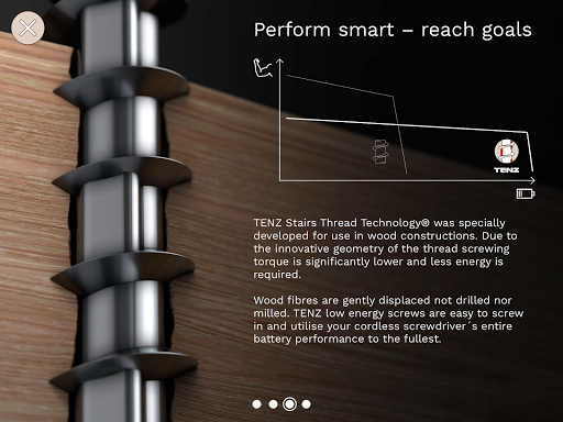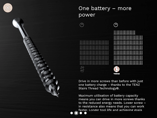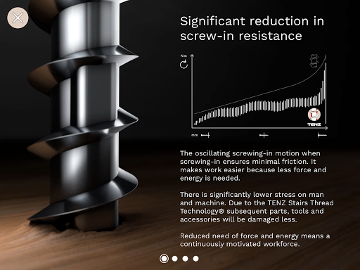 The virtual 3D model of the screw shows the revolutionary TENZ Stairs Thread Technology® up close. Additional Infoscreens illustrate the advantages of the technology.