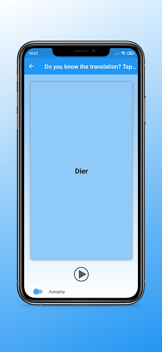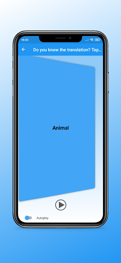 Tap on the card to see the translation of the word. Tap on the play button to hear how to speak the word in a correct way.