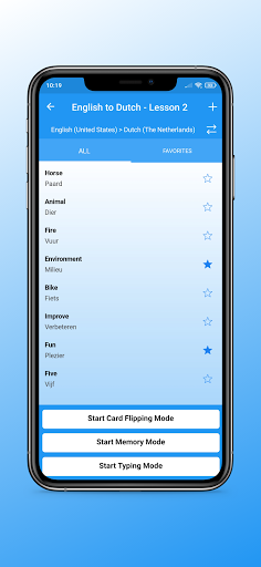 Tap on the cards and search for matching words. For this you need to memorize the translation and the position of the words. Using this mode you train both short term memory (position of cards) and long term memory (translations).