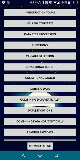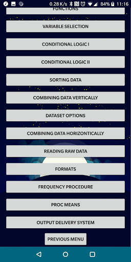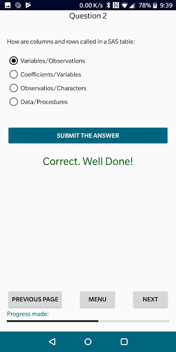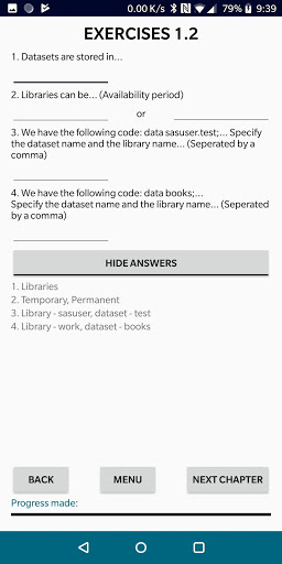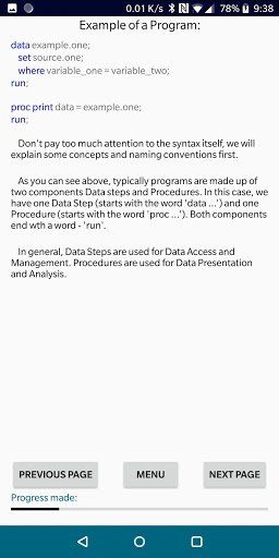 If you answered 'Yes' to any of the above, then look no further. This application is designed to help you learn the basics of SAS in short, direct lessons. Your knowledge will then be tested in a couple of different ways: tests and coding exercises.