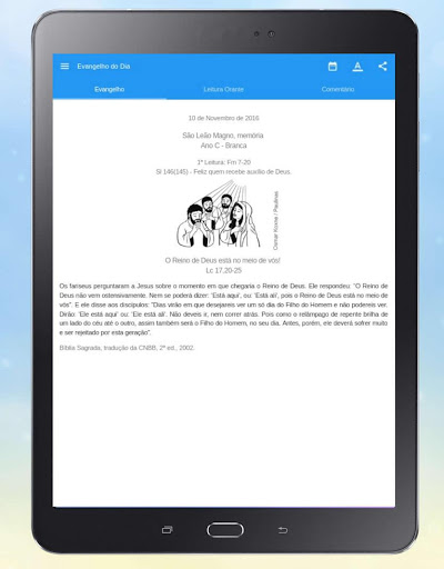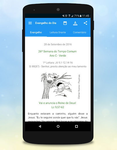 - Oriente seu dia pelos ensinamentos de Jesus meditando o Evangelho da liturgia diária, com o auxílio de roteiros da leitura orante que acompanham comentários e reflexões.