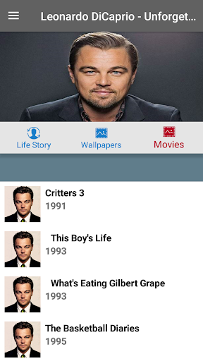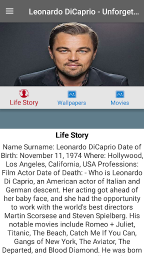 His whole life story and movies. Wallpapers of movie artist Leonardo DiCaprio and more in one app