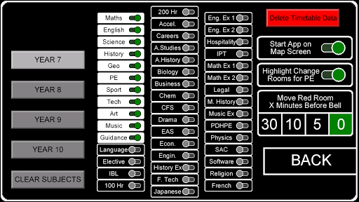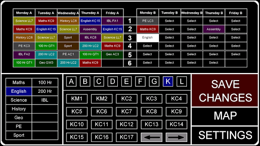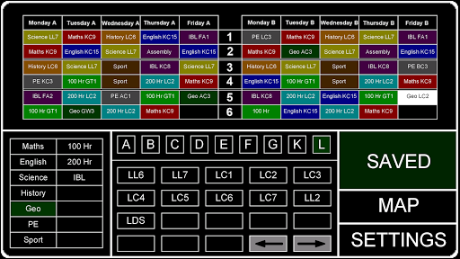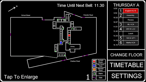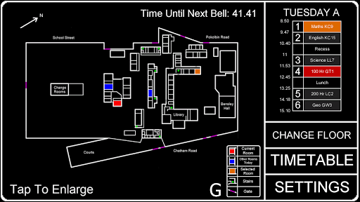 After a user has imputed their timetable, they can view a map with their current room highlighted in red, other subjects on the same day in blue and the timetable for that specific day displayed in the corner. The app also displays the current day and week (A/B), the bell times and how long is left in the current period. Additionally, the map includes a zoom feature on the map for smaller screens. The app also has a variety of settings so the app can be tailored for an individual's use.