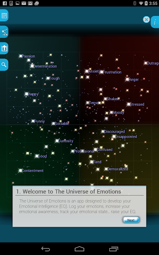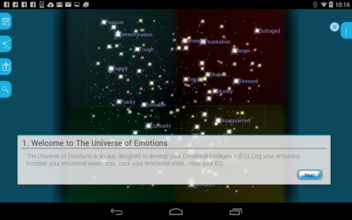The Universe of Emotions App helps to increase Emotional Intelligence (EQ). The app contains a ‘universe’ of more than 2,000 emotions. The user can note their own emotional state, explore similar emotions and share their experience with friends.