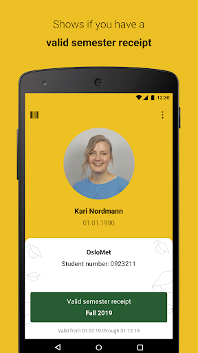 Digital student ID for Norwegian students. The application is accepted as a valid student ID by transport service companies in Norway. Payment of semester fee and semester registration are required before use.