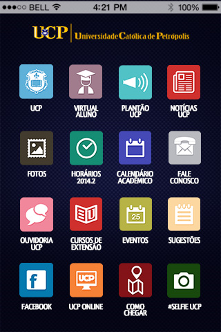 Tenha na sua mão todas as informações da sua Universidade. O UCP Mobile traz para os alunos todas as informações acadêmicas da UCP como horários de aulas, calendário de eventos, acesso ao Virtual Aluno, entre outras funções.