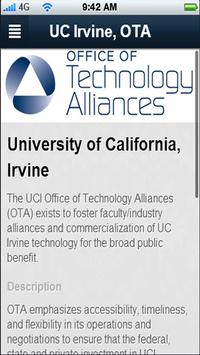 The UCI Office of Technology Alliances (OTA) exists to foster faculty/industry alliances and commercialization of UC Irvine technology for the broad public benefit. OTA emphasizes accessibility, timeliness, and flexibility in its operations and negotiations to ensure that the federal, state and private investment in UCI research has the greatest possible positive impact on people and the economy.