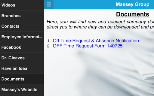 This app features resources for Massey Group employees. It contains a company documents section, contacts list, office locations and information, information regarding the clinic for employees, links to the company websites, and a few other features that will keep you connected and informed!
