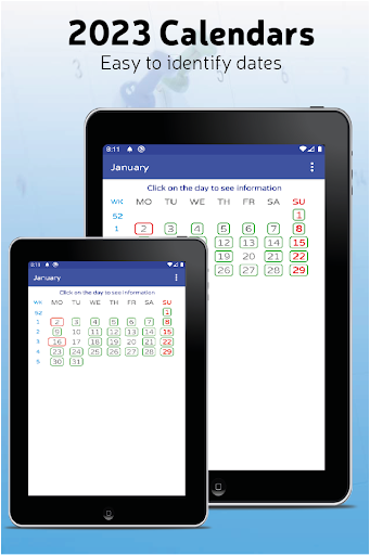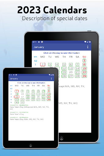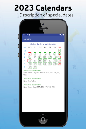 The images contained in this Calendars 2023 with holidays application have been downloaded from free Internet sites, free images that do not have intellectual property.