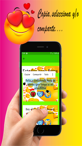 The best phrases for your profile or status or to share with friends. Choose one of the phrases and send it to your friends, your friends to your true love. Download this app for free and you will discover the best phrases to make you happy, beautiful and cute love phrases that everyone likes, the best quotes from famous authors, positive motivating phrases to reflect and make you think, humor phrases or at least they will produce a smile, friendly phrases to send to your friends, funny and funny phrases to laugh with your group or put it in your state.