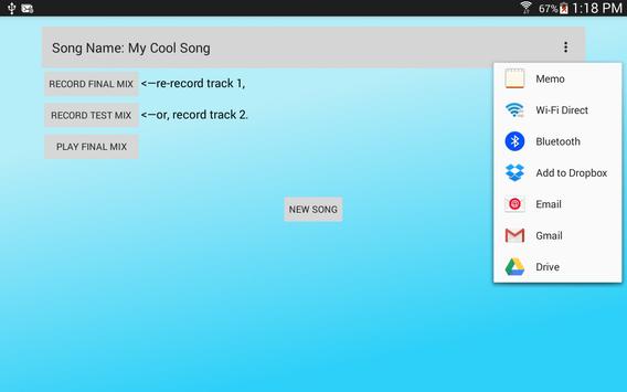 You may wonder how the sharing or collaborative song-making works. When you tap the "SHARE FINAL MIX" menu item, you are presented with all the different ways your phone has available to share the "Final Mix" version of your song with friends. My phone has 11 ways, some of which are: Gmail, Google Drive, and Android Beam.