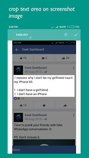 3. Drag the corners of crop view to select the text and also select language to OCR then save.