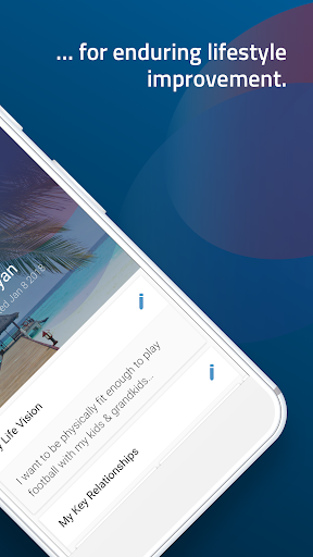 Profile screen - upload photo, build Vision and Key Relationships, view and select recommended Programme Goals, view Programme Goals that are in progress and ended