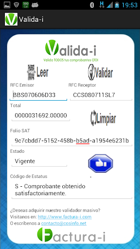 La aplicación realiza la consulta de la factura que estás leyendo directamente en el SAT utilizando el RFC del Emisor, el RFC del Receptor, el Importe Total de la Factura y el ID o Folio del SAT.