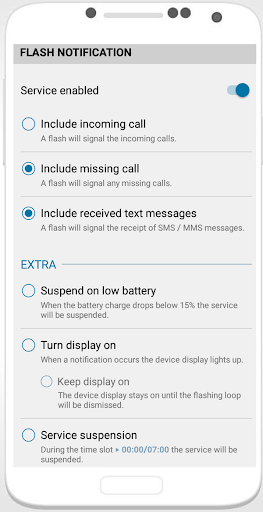 You can also get flash alerts during particular time as well and you have option to change the blinking frequency like if you want flash alerts to be slow or high. You will have control the phone mode from inside the app that is normal mode / silent mode / vibrate. You have option to set up blinking with ON/OFF in detail.