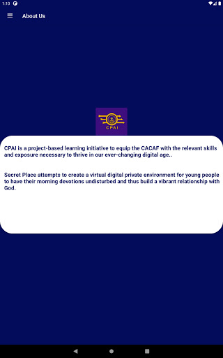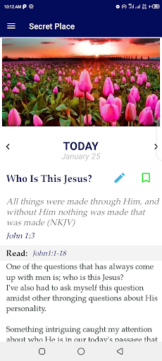 Secret Place creates a virtual digital environment for young people to have daily morning devotions undisturbed, void of other app's notifications thus helping them build a vibrant and blossom relationship with God. It contains write-ups from seasoned young writers who are hungry for revival and spiritual growth and developments amongst youths around the world.