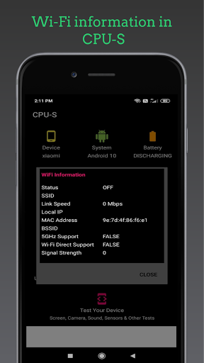 Wi-fi information : Status,SSID,Link Speed,Local IP,,MAC Address,BSSID 5GHz Support,Signal Strength.