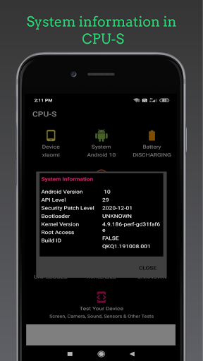 System information : Android Version,API Level,Security Patch Level,Bootloader,Kernal Version,Root Access,Build ID.