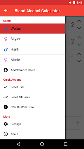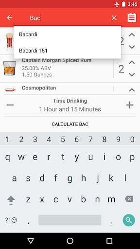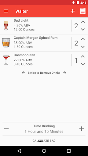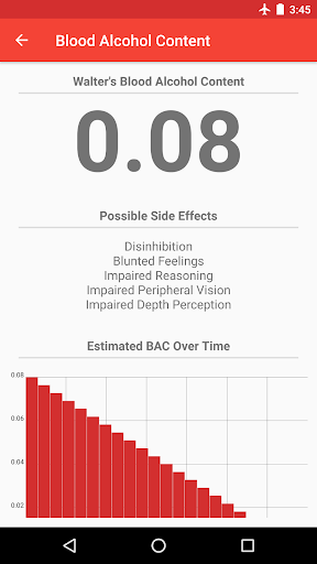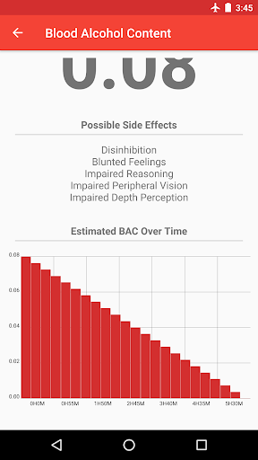 With Blood Alcohol Calculator you can quickly and easily calculate your blood alcohol content (BAC) by entering a few basic pieces of information. First, create user profiles for you and your friends by entering your name, weight, and gender. Once you've created a user you can add drinks to that user by selecting one of hundreds of built-in drinks or by creating your own custom drinks by adding that awesome cocktail you made at home or that tasty microbrew you just discovered. Lastly, enter how long you've been drinking and calculate the blood alcohol content of you and your friends. This includes a decimal representation of your blood alcohol content (BAC) (Such as 0.08), some possible side effects related to that blood alcohol range, as well as a detailed graph letting you know what your blood alcohol content (BAC) will be over time.