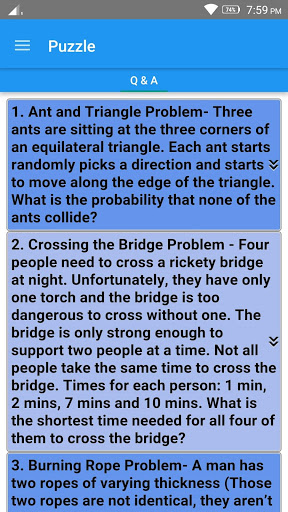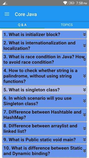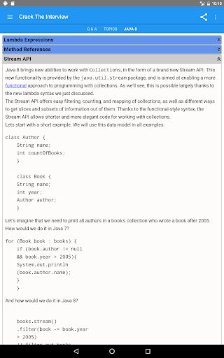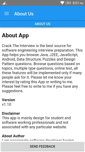 Crack The Interview is the best source for software engineering interview preparation. This App helps you browse Java, J2EE, JavaScript, Android, Data Structure, Database / SQL, Puzzles, Design Pattern questions and HR interview questions. Browse questions based on topics, multiple type questions, online test, all these features will be implemented only if many people ask for it. Please let me know your interest by rating this App or writing to me. Please feel free to write to me if you have any suggestions.