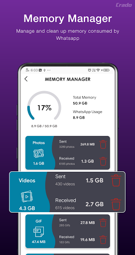 Manages the memory used by WhatsApp media files. Displays the real-time storage consumed by WhatsApp. Enables you to clean your WhatsApp Media Files at once if your phone runs out of memory.