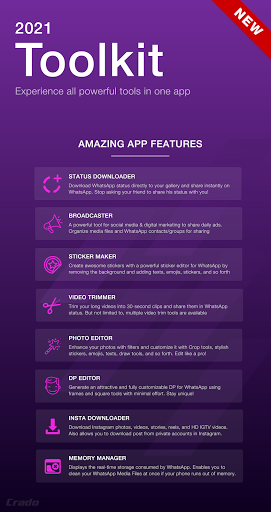 Toolkit for WhatsApp presents you with all the mind-boggling features required in 2021. From Status Saver for WhatsApp to some exciting tools like Broadcaster, Sticker creator/generator, Video trimmer for WhatsApp status, Photo Editor, DP Editor for WhatsApp, Insta Downloader for Instagram, Memory Manager to manage WhatsApp media files, and so forth