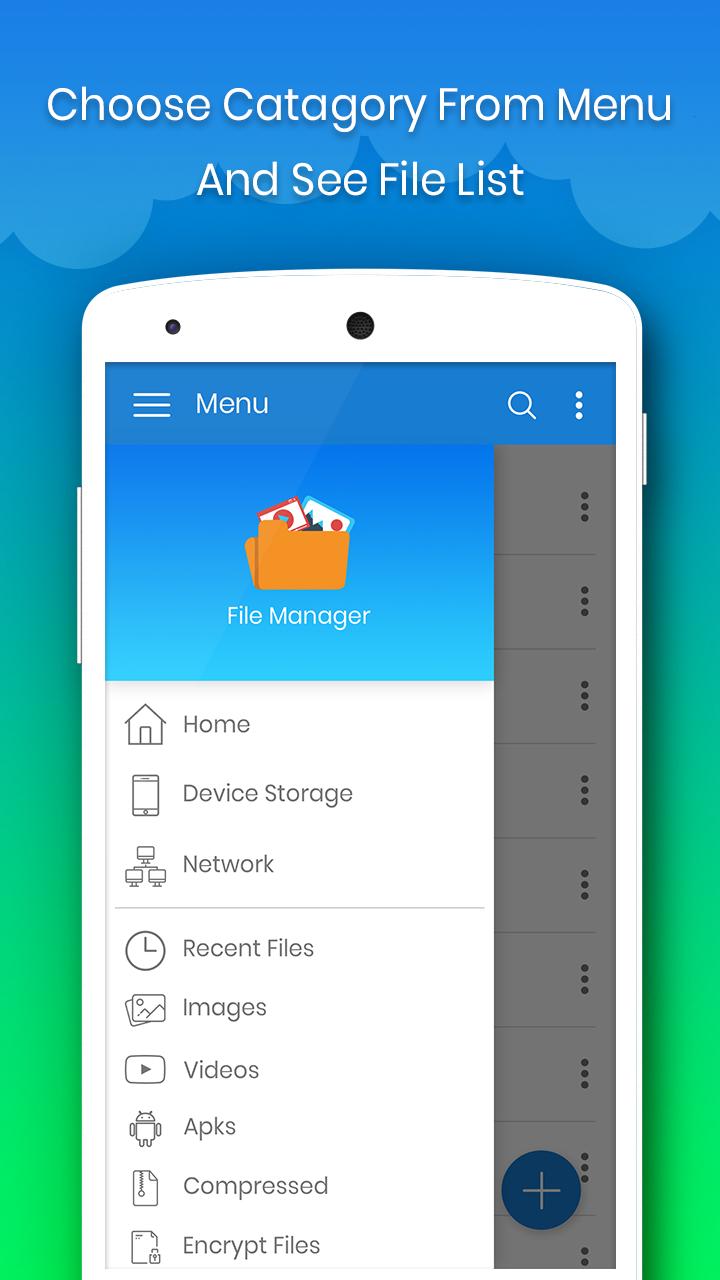 It supports every file management actions (open, search, navigate directory, cut / copy / paste, rename, delete, compress, decompress, transfer, download, bookmark, and organize). File Manager supports media files and major file formats including apk.