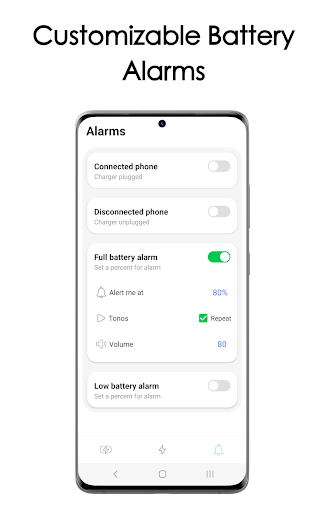 Full battery alarms will notify when your phone reach an amount of percentage to avoid battery damage, also we've a low battery alarm for alert you completely customizable with ringtones, volume, and repeater