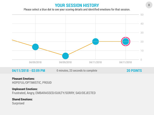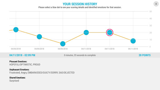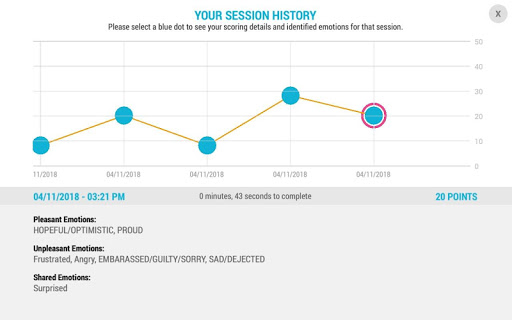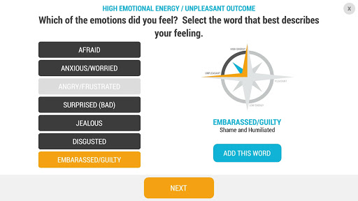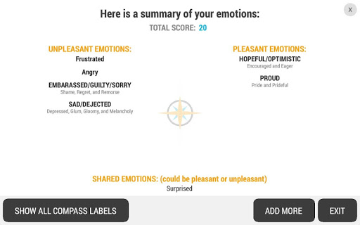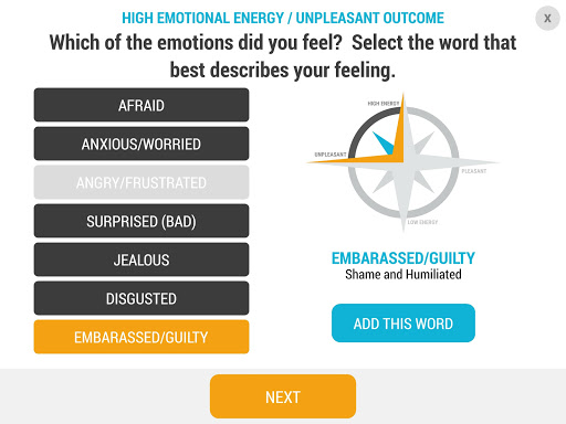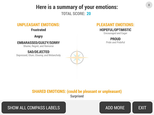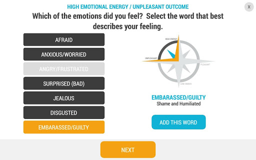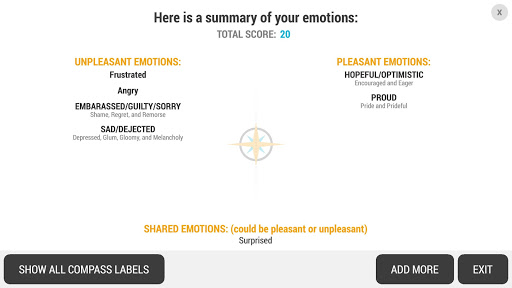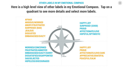 My Emotional Compass will encourage you to use labels that are specific. The more emotional labels, the more points. More points suggest greater mastery of your emotions. Built-in charting helps you track your progress.