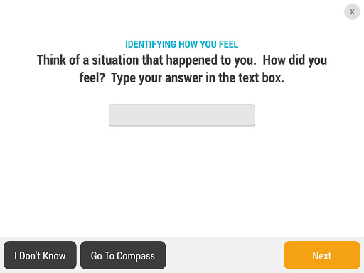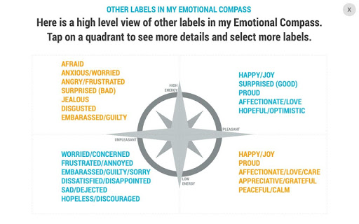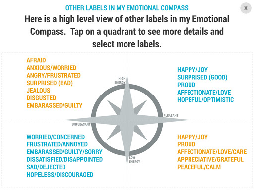 My Emotional Compass systemically guides people through a series of guided prompts, helping them to hone in on the words that best describe the emotions they are feeling.