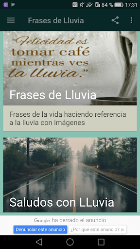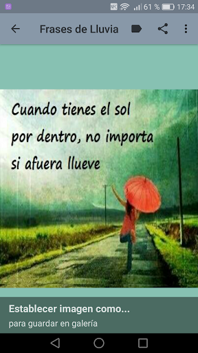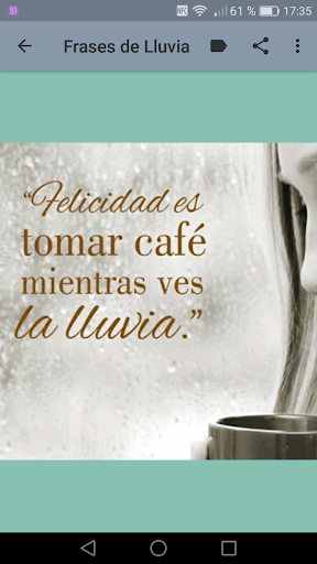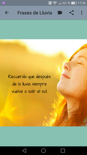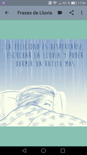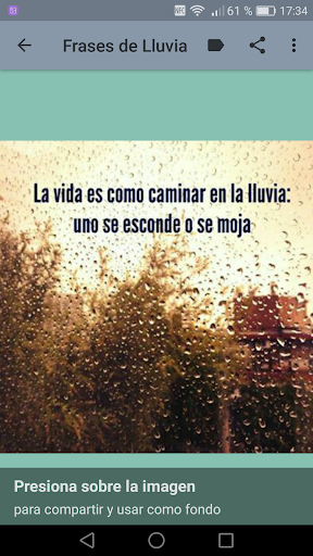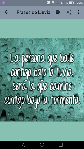 Descarga ya mismo esta aplicación ideal para dar importancia a la vida, al amor y disfruta enviando imagenes con frases de lluvia. A la vez podrás escuchar sonidos de lluvia con truenos y lluvia sin tormenta, así como la canción "Llorando bajo la lluvia"