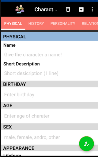 This new, expanded version of Character Notes has been updated for the latest versions of Android. Many new traits have been added for more flexibility and creativity. There is now a section for you to write out a few paragraphs about the character, so you get more writing practice.