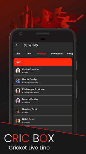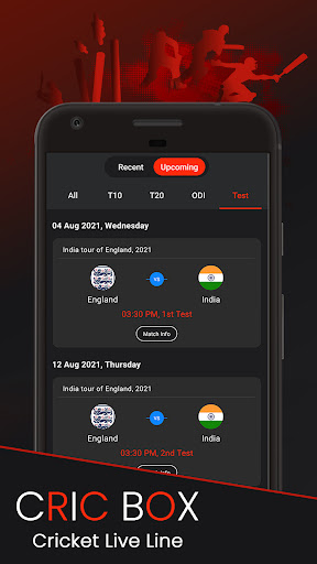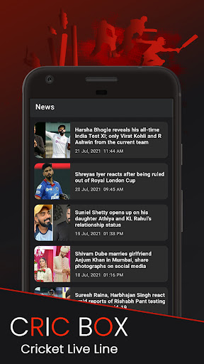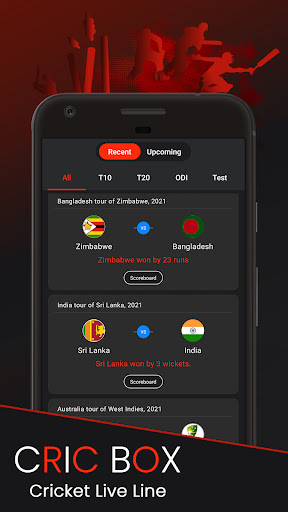 CricBox - Fast Cricket Live Line app contains Super-Fast Ball by Ball Live Score updates of all cricket matches, Fixtures, Teams details, Match Schedules and full coverage of the series, Player Details, Cricket News, Recent Match Results and many more.