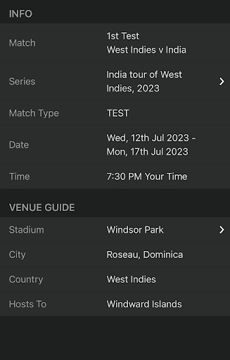 - Upcoming and recent cricket match details
