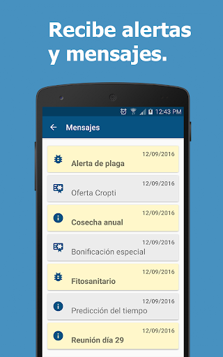 ✓ Servicio de mensajería. Comunicación entre el técnico y sus agricultores. Recibe alertas de plagas.
