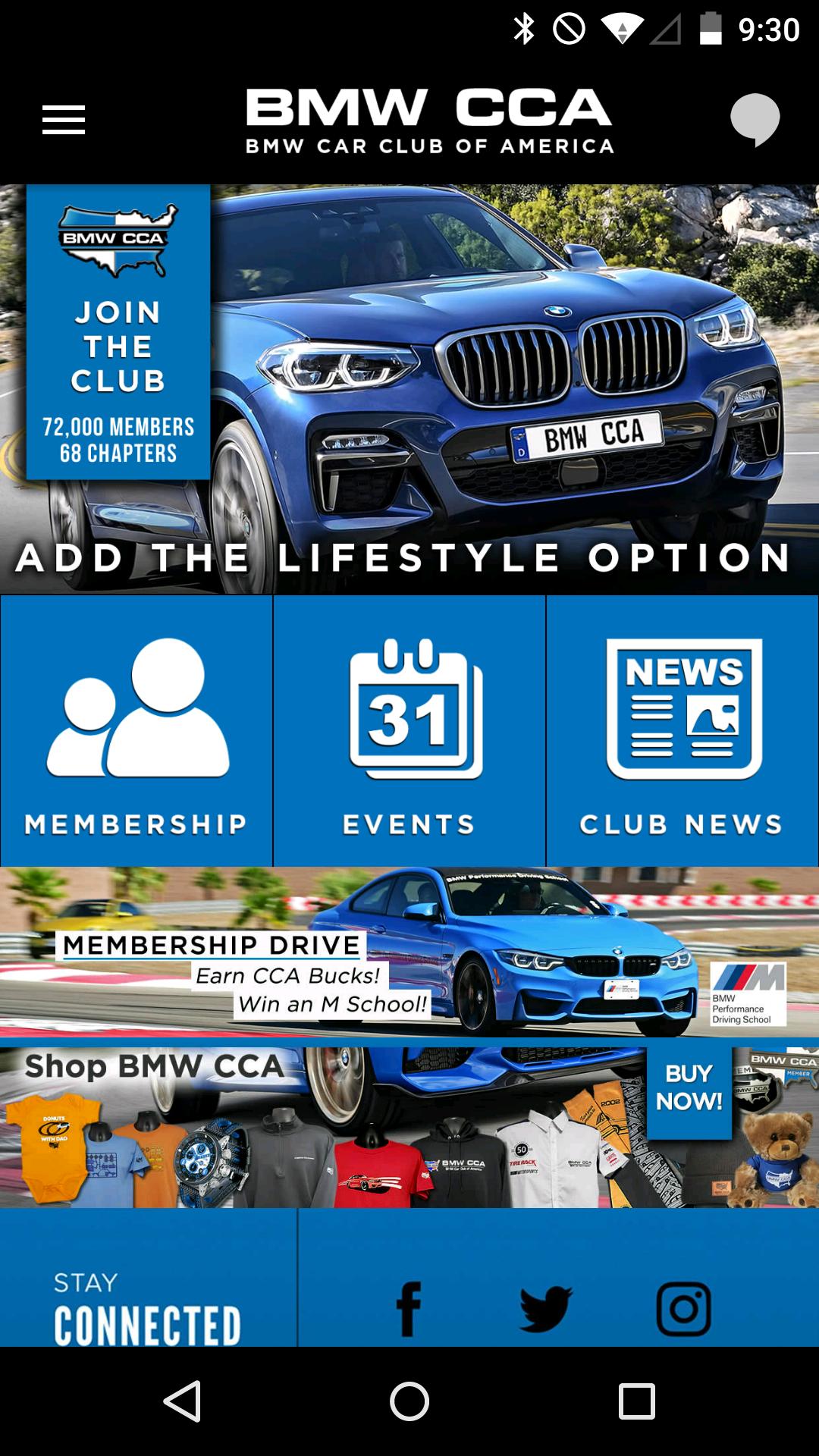 Social: Keep up with BMW CCA's Instagram, Facebook, and Twitter feeds directly from the app and share the Club experience with friends!