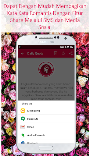 Anda bisa mendapatkan notifikasi kata cinta setiap harinya karena terdapat fitur kata cinta hari ini. Anda juga dapat dengan mudah membagikan kata-kata tersebut karena terdapat fitur share melalui sms dan media sosial lainnya.