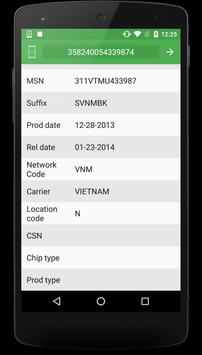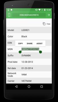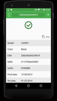 The application shows many information for your LG phone such us the model, color, suffix, esn date (prod date), esn go date (rel date), network code, carrier, chip type and more