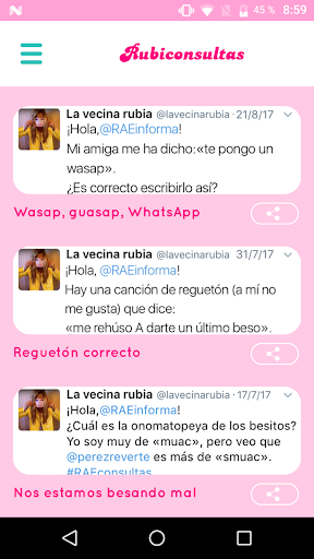 En esta app encontrarás las particulares consultas de “La vecina rubia” a la RAE, normas ortográficas y frases elocuentes, organizadas de la siguiente manera: