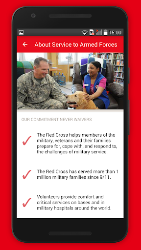 The app also guides users through the various services offered by the Red Cross to assist families before, during and after deployments, as well as containing a variety of other critical information:VA facilities locations, benefits information, mental health/substance abuse and job resources.