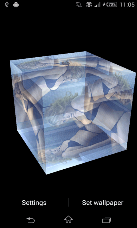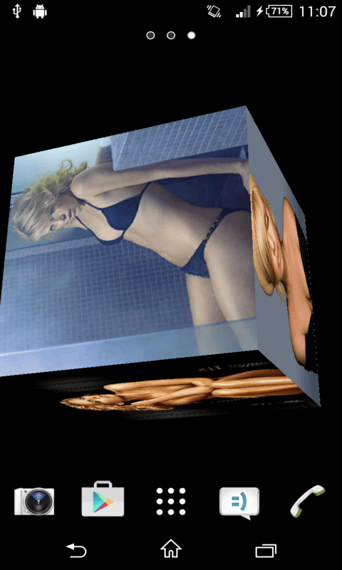 Charlize Theron Live Wallpaper features a rotating 3D photo cube showing the sexy and hot pictures from selected image. This contains many HD quality hot girl pics . Select your favorite sexy image from setting /change image to display in rotating cube. This is only for android and totally free. You can rotate Charlize Theron LWP by swiping through your home screens - scene will change its rotation according to touches. Features- ----------------------------- This contains many HD quality Hot and sexy pics. Manually change the cube images by the click change image. Increase or decrease brightness, if transparent Enabled. Adjust the size of the 3D cube by click of Cube Size. Many different hot Images choice are available. DISCLAIMER--- Its a free android app thus it contains some ads, but it doesn't contain any push ads or home screen ads