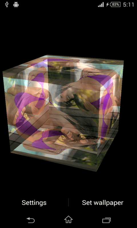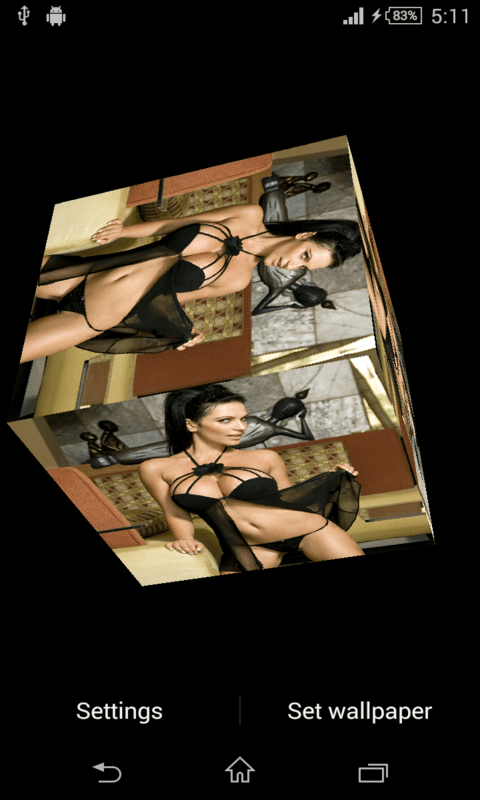 Sexy Cleavage Live Wallpaper features a rotating 3D photo cube showing the sexy and hot pictures from selected image. This contains many HD quality hot girl pics . Select your favorite sexy image from setting /change image to display in rotating cube. This is only for android and totally free. You can rotate Sexy Cleavage LWP by swiping through your home screens - scene will change its rotation according to touches. Features- ----------------------------- This contains many HD quality Hot and sexy pics. Manually change the cube images by the click change image. Increase or decrease brightness, if transparent Enabled. Adjust the size of the 3D cube by click of Cube Size. Many different hot Images choice are available. DISCLAIMER--- Its a free android app thus it contains some ads, but it doesn't contain any push ads or home screen ads