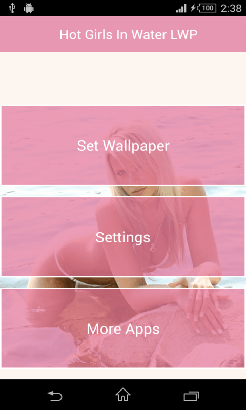 Hot Girls In Water LWP features a rotating 3D photo cube showing the sexy and hot pictures from selected image. This contains many HD quality hot girl pics . Select your favorite sexy image from setting /change image to display in rotating cube. This is only for android and totally free. You can rotate Hot Girls In Water LWP by swiping through your home screens - scene will change its rotation according to touches. Features- ----------------------------- This contains many HD quality Hot and sexy pics. Manually change the cube images by the click change image. Increase or decrease brightness, if transparent Enabled. Adjust the size of the 3D cube by click of Cube Size. Many different hot Images choice are available. DISCLAIMER--- Its a free android app thus it contains some ads, but it doesn't contain any push ads or home screen ads