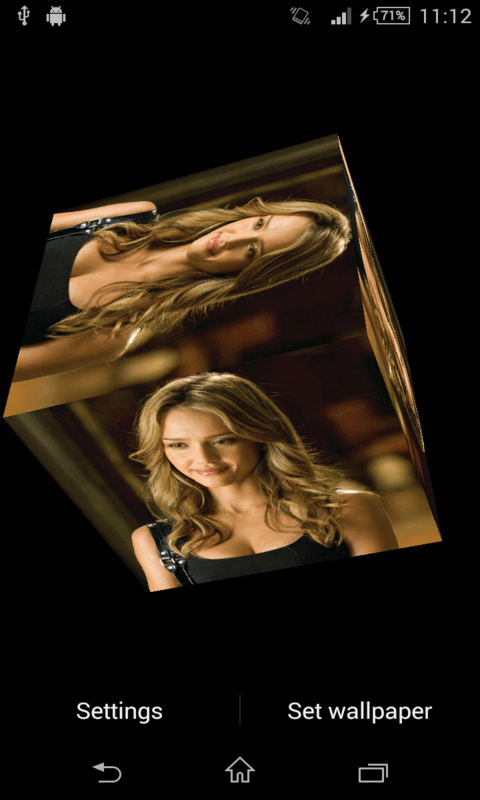 Jessica Alba Live Wallpaper features a rotating 3D photo cube showing the sexy and hot pictures from selected image. This contains many HD quality hot girl pics . Select your favorite sexy image from setting /change image to display in rotating cube. This is only for android and totally free. You can rotate Jessica Alba LWP by swiping through your home screens - scene will change its rotation according to touches. Features- ----------------------------- This contains many HD quality Hot and sexy pics. Manually change the cube images by the click change image. Increase or decrease brightness, if transparent Enabled. Adjust the size of the 3D cube by click of Cube Size. Many different hot Images choice are available. DISCLAIMER--- Its a free android app thus it contains some ads, but it doesn't contain any push ads or home screen ads