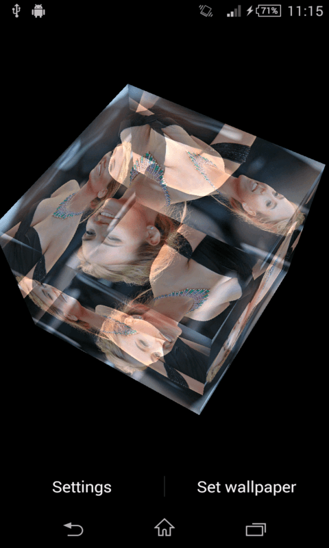 Scarlett Johansson Live Wallpaper features a rotating 3D photo cube showing the sexy and hot pictures from selected image. This contains many HD quality hot girl pics . Select your favorite sexy image from setting /change image to display in rotating cube. This is only for android and totally free. You can rotate Scarlett Johansson LWP by swiping through your home screens - scene will change its rotation according to touches. Features- ----------------------------- This contains many HD quality Hot and sexy pics. Manually change the cube images by the click change image. Increase or decrease brightness, if transparent Enabled. Adjust the size of the 3D cube by click of Cube Size. Many different hot Images choice are available. DISCLAIMER--- Its a free android app thus it contains some ads, but it doesn't contain any push ads or home screen ads