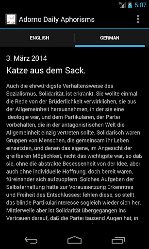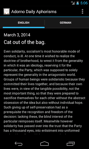 Let acclaimed German philosopher Theodor W. Adorno's wise words guide you through this wild and crazy late capitalist world. Whether you're feeling anxiety about your love life or the good life, worried about friends or fascism, or looking to better understand art or struggling with class struggle, Adorno is there for you, every day coming to you with a new and insightful aphorism on the modern condition. Adorno Daily Aphorisms includes over 150 different aphorisms from Adorno's seminal "Minima Moralia: Reflections From Damaged Life", both in the original German and in English translation.