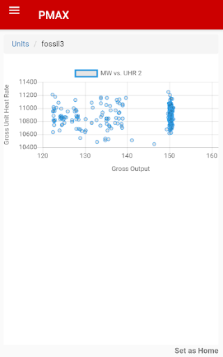 • A graph of the most recent 24 hours of unit gross heat rate versus gross generation can be displayed for any listed unit.