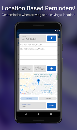 📍 Location based reminders! Get reminded when you arrive or leave an area using GPS! Remind yourself to grab peanut butter when arriving at a grocery store!