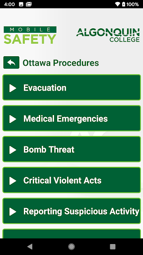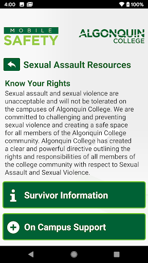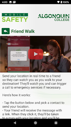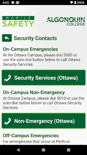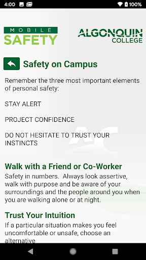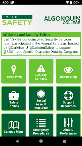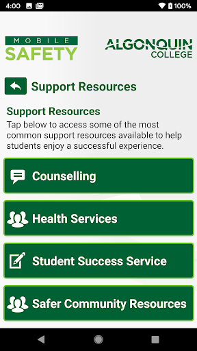 Mobile Safety was developed by the Safety, Security & Emergency Management department of Algonquin College. This app contains a wide set of resources to stay safe while on campus. These resources include quick access to emergency staff, campus maps, support resources, and a personal safety toolbox.